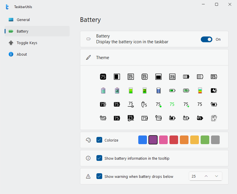 TaskbarUtils displays the battery percentage and the toggle key status in taskbar icons. You can use the trial version without any time limit, or you can purchase a lifetime license for only $9.99 and use all the battery icon themes without restriction. Supports light or dark taskbar theme, high dpi settings and is compatible with Windows 10 and Windows 11.